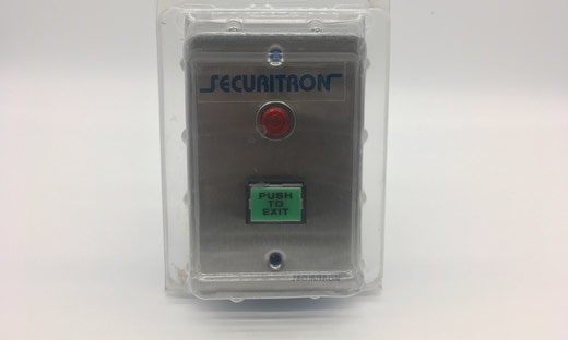 The Securitron Model PB features an industrial grade 1-1/2" mushroom button with 7 Amp DPST (NO/NC) contacts. It is waterproof (NEMA4) and includes 12-24 VDC bi-colour illuminations.